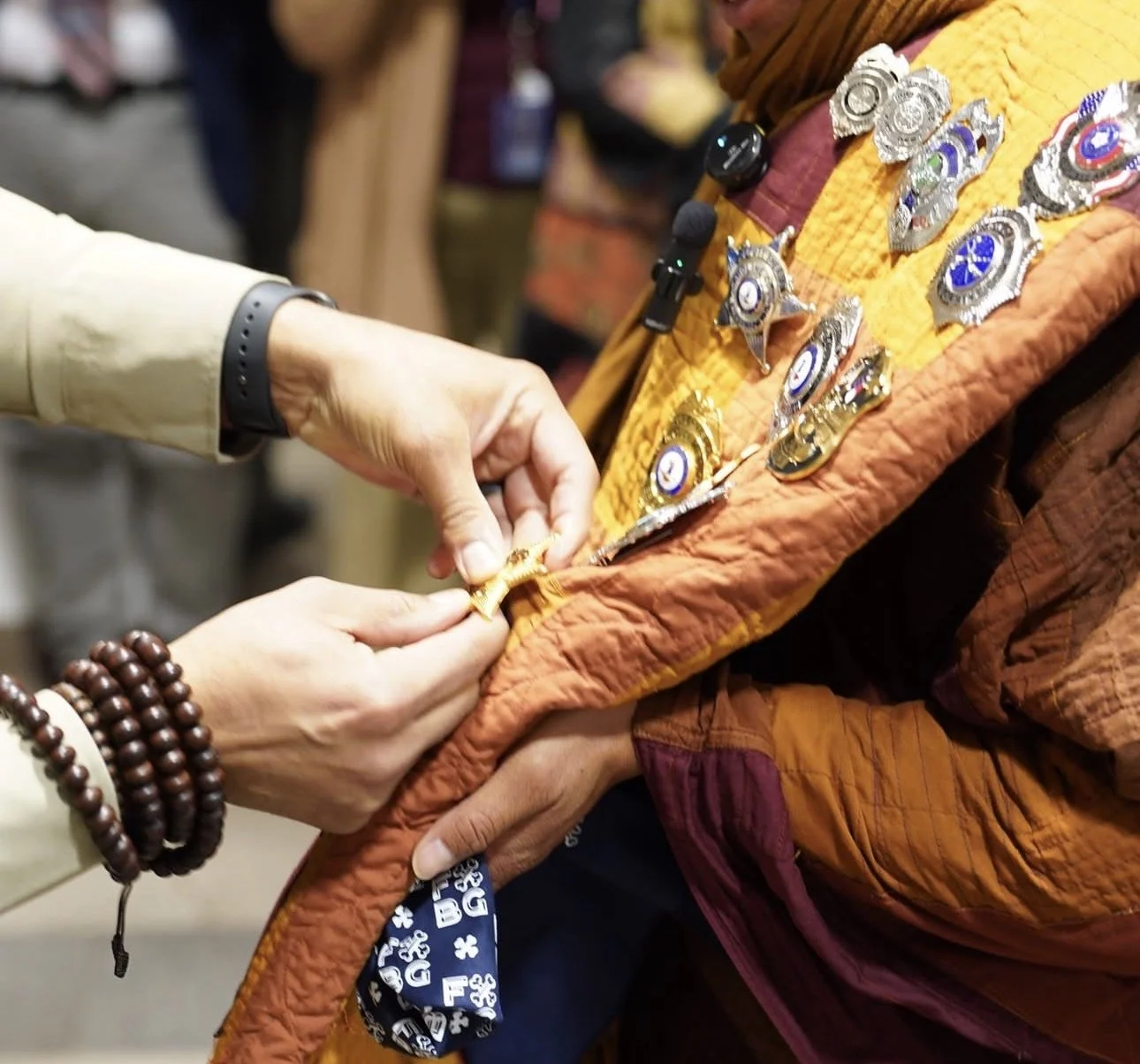 Inside, Bhikkhu Paññākāra honored law enforcement officers who had escorted the walk. In photos you can see badges pinned to his outer robe, given by officers as offerings, as prayers for peace. He reflected that their work is, in essence, similar to the monks’ work. The monks put their bodies and footsteps down for peace. Officers put their bodies and footsteps down in protection of peace.