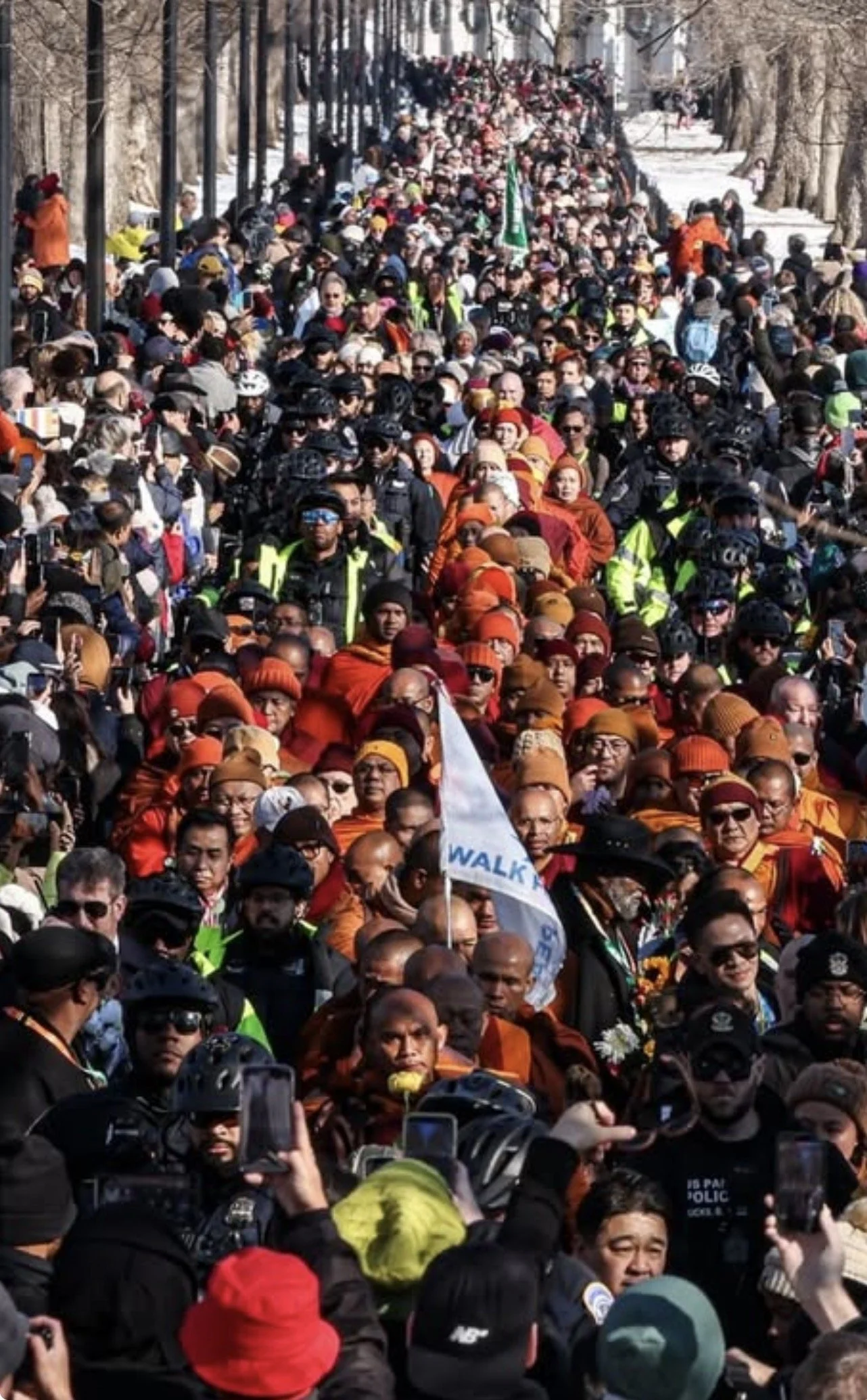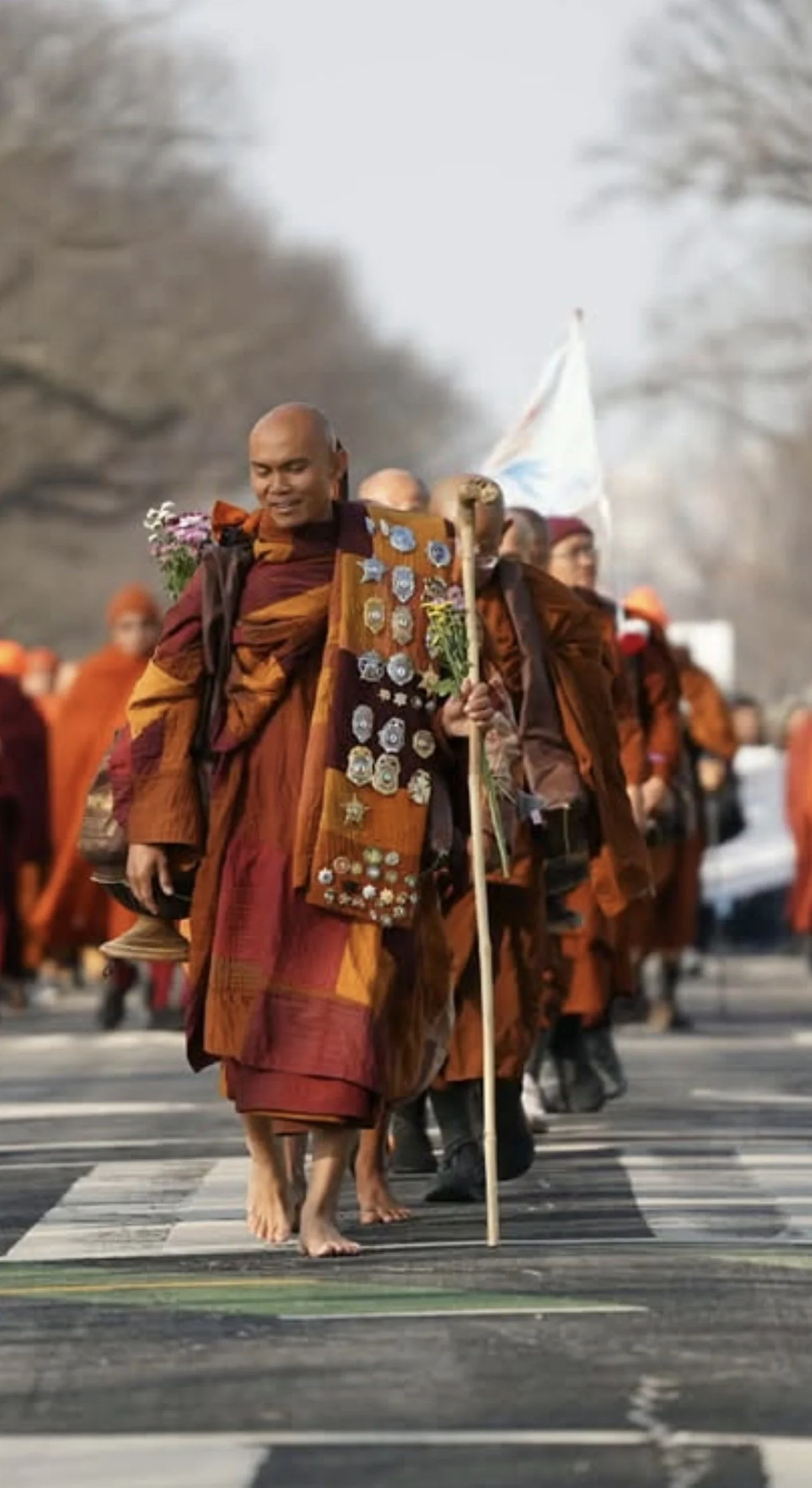 I drove to Washington to walk with the monks walking for peace. Nineteen Theravada monks, and one dog named Aloka, had spent months crossing the country on foot, walking roughly 2,300 miles, about 3,700 kilometers. Some were based at the Huong Dao Vipassana Bhavana Center in Fort Worth, Texas, and others came from Theravada monasteries around the world.