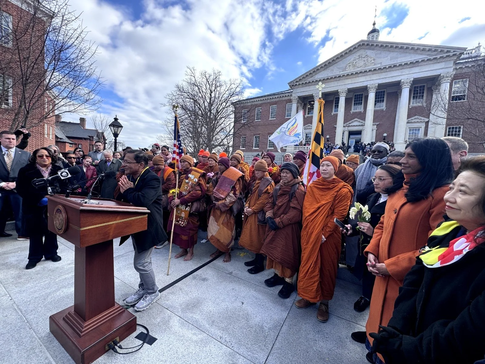 Walk for Peace monks at the largest rally ever in Annapolis, with Lt. Gov. Aruna Miller and Secretary of State Susan Lee, February 12th 2026