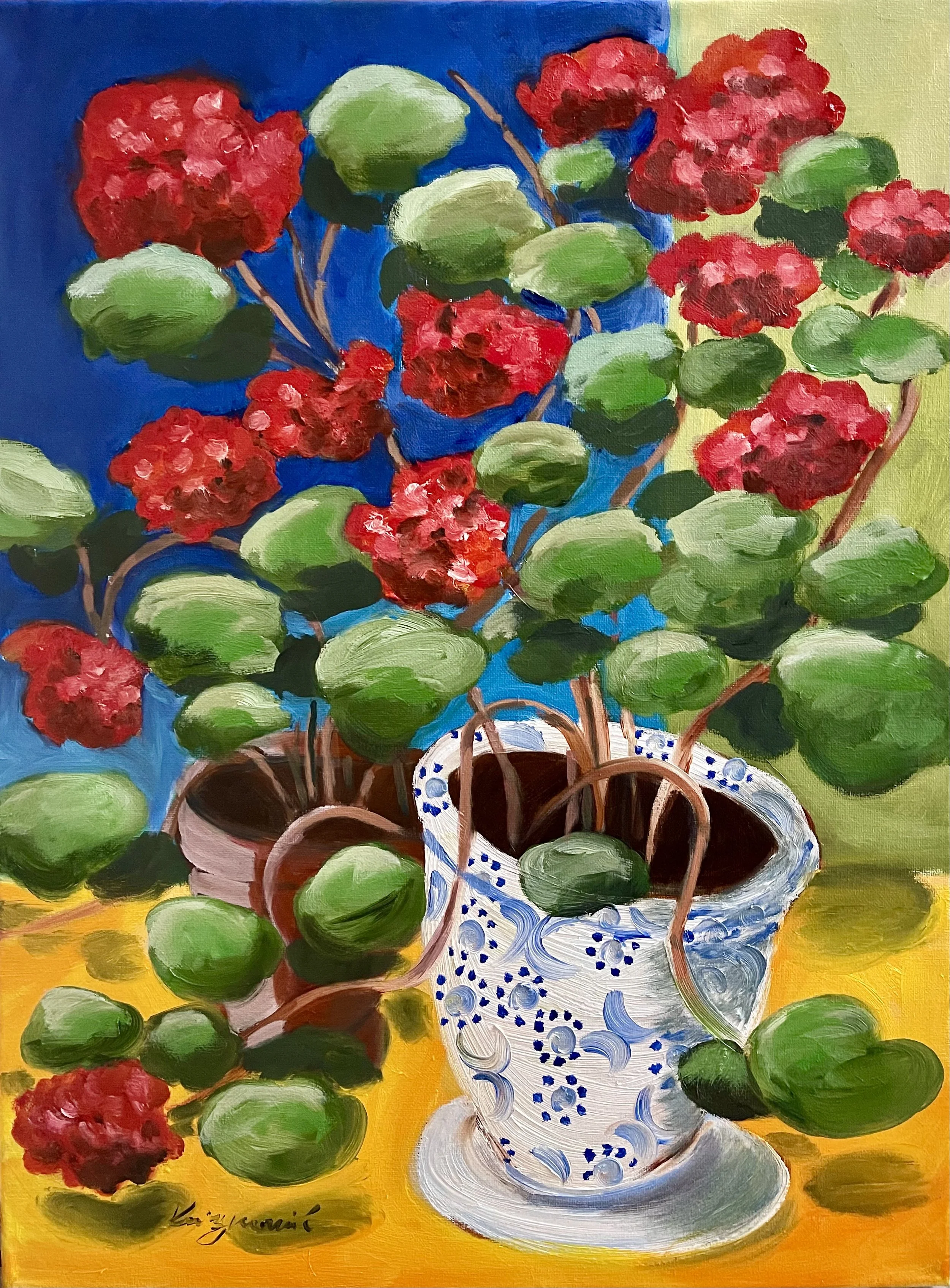 13. Two Geraniums, oil on canvas, 24” X 18”