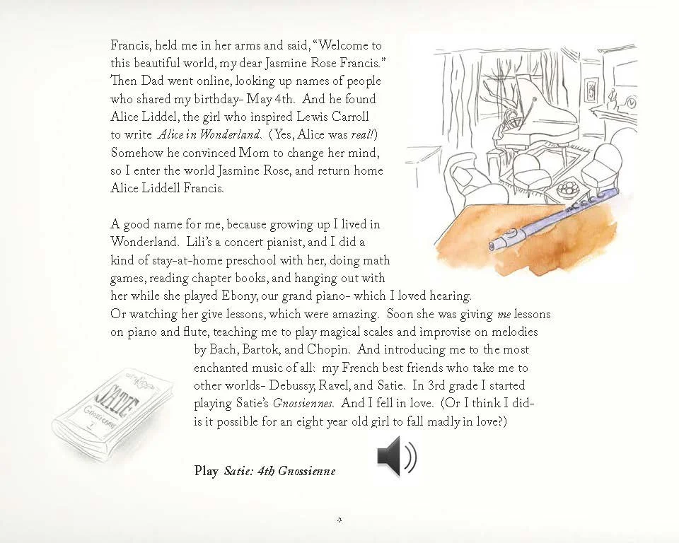 Cover and inside pages for the interactive e-book Alice’s Adventures by author and composer Claud Brown