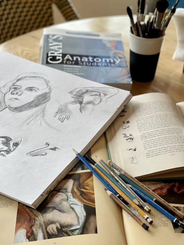 hard pastel sticks in grey, black and burnt sienna or raw umber