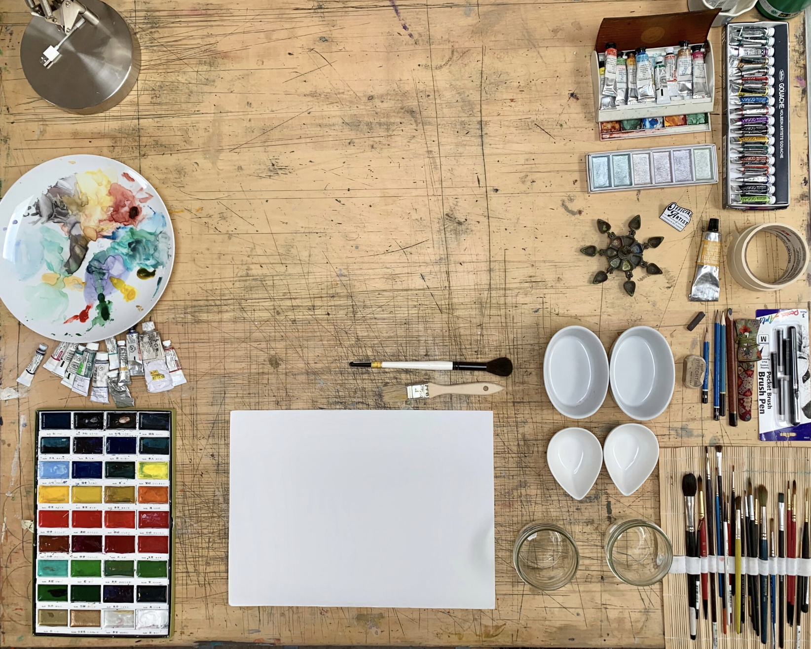 Here is a sample of what a good set up might look like. If you have a desk or dining table you can occupy for the session, that is ideal. Make sure that you have your materials neatly laid out and that you have a palette or plate for mixing, two water jars - one for mixing and one for cleaning the brushes, and several mixing bowls. Good light, either natural or lamp with a tungsten bulb is important, ideally coming from the left if you are right handed and from the right if you are left handed. If you wish you can use masking tape to tape off the edges of the paper and fix the paper to the surface you are working on. If you can leave a fairly large space in front of you empty, that would be best for our work with the compositions for still life paintings.